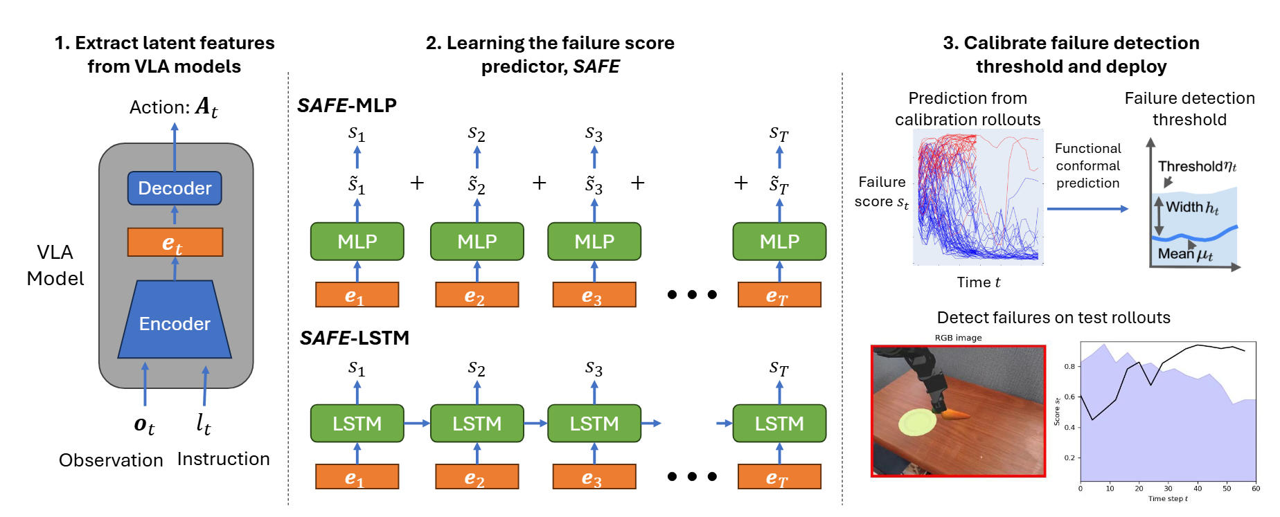 While vision-language-action models (VLAs) have shown promising robotic behaviors across a diverse set of manipulation tasks, they achieve limited success rates when deployed on novel tasks out-of-the-box. To allow these policies to safely interact with their environments, we need a failure detector that gives a timely alert such that the robot can stop, backtrack, or ask for help. However, existing failure detectors are trained and tested only on one or a few specific tasks, while VLAs require the detector to generalize and detect failures also in unseen tasks and novel environments. In this paper, we introduce the multitask failure detection problem and propose SAFE, a failure detector for generalist robot policies such as VLAs. We analyze the VLA feature space and find that VLAs have sufficient high-level knowledge about task success and failure, which is generic across different tasks. Based on this insight, we design SAFE to learn from VLA internal features and predict a single scalar indicating the likelihood of task failure. SAFE is trained on both successful and failed rollouts, and is evaluated on unseen tasks. SAFE is compatible with different policy architectures. We test it on OpenVLA, π0, and π0-FAST in both simulated and real-world environments extensively. We compare SAFE with diverse baselines and show that SAFE achieves state-of-the-art failure detection performance and the best trade-off between accuracy and detection time using conformal prediction.